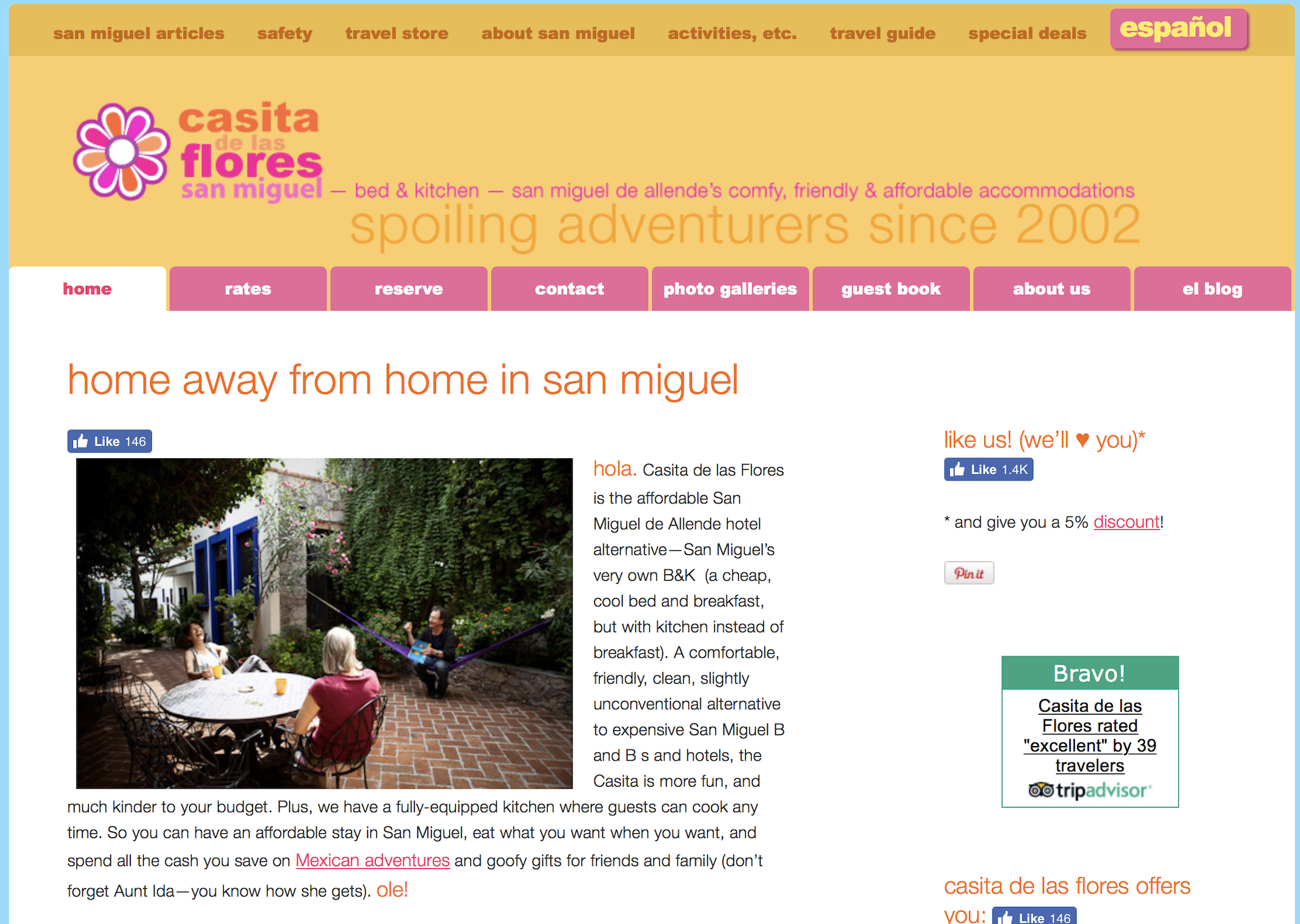 The website became not only our main promotional tool, but an irreverent blog on issues relating to San Miguel and travel in Mexico, as well as a San Miguel guide — both of which provided a service, as well as drawing potential customers. I followed the same service philosophy in my subsequent business website, Casa Oasis Troncones, which also serves as a very detailed guide to Troncones.